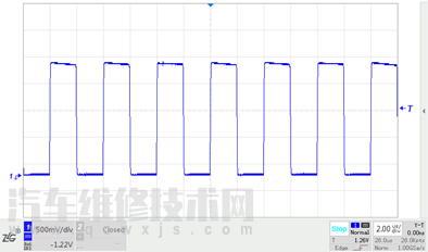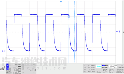 在顯性狀態(tài)期間,總線的寄生電容會(huì)被充電,而在恢復(fù)到隱性狀態(tài)時(shí),這些電容需要放電。如果CANH、CANL之間沒有放置任何阻性負(fù)載,電容只能通過收發(fā)器內(nèi)部的差分電阻放電,這個(gè)阻抗是比較大的,按照RC濾波電路的特性,放電時(shí)間就會(huì)明顯比較長(zhǎng)。我們?cè)谑瞻l(fā)器的CANH、CANL之間加入一個(gè)220PF的電容進(jìn)行模擬試驗(yàn),位速率為500kbit/s,波形如圖,這個(gè)波形的下降沿就是比較長(zhǎng)的狀態(tài)。