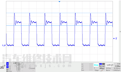 別人進(jìn)行了一個(gè)模擬試驗(yàn)(圖片都是我抄過來(lái)的),位速率為1Mbit/s,收發(fā)器CANH、CANL接一根10m左右的雙絞線,收發(fā)器端接120Ω電阻保證隱性轉(zhuǎn)換時(shí)間,末端不加負(fù)載。末端信號(hào)波形如圖所示,信號(hào)上升沿出現(xiàn)了振鈴。