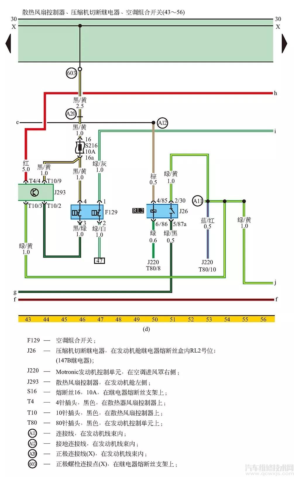如果發動機電腦不允許空調電路工作,則J220/T80/8腳就會輸出低電壓信號至J26/86,否則J220/T80/8腳將會輸出高電壓信號至J26/86,見圖中50位置,控制J26的觸點保持閉合,其工作過程如下。在電路圖的50位置上有。