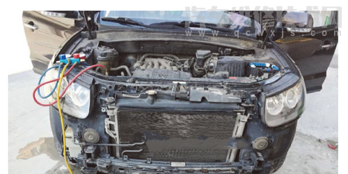 車型:2008年款進口現代新勝達。行駛里程:169000公里。 車主反映在洗車的一段時間空調制冷效果良好,但是行駛一段時間后空調間隙性不制冷。接上空調壓力表,發現低壓為3bar,高壓為20bar,明顯的壓力雙高、散熱不良,在潑了一桶冷水下去后,高壓為13bar,低壓為3bar,轉速穩在2000r/min時高壓為14bar,低壓為2bar,因此判斷是空調冷凝器散熱不良(下圖)。