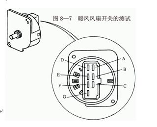 暖風風扇開關測試導通性如表8—12所示。請參考接頭視圖8—7,檢查風扇開關端子間的導通性。表8—12暖風風扇開關測試導通性