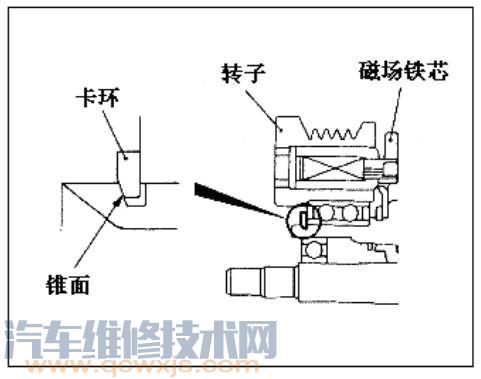 直接將蓄電池的正極端子接到電磁離合器的插接件上,蓄電池的負(fù)極端子接到壓縮機(jī)本體上。如果電磁離合器正常,則會(huì)發(fā)生“卡嗒”一聲,如果皮帶輪和電樞沒(méi)有接觸(無(wú)“卡嗒”聲),則存在故障。