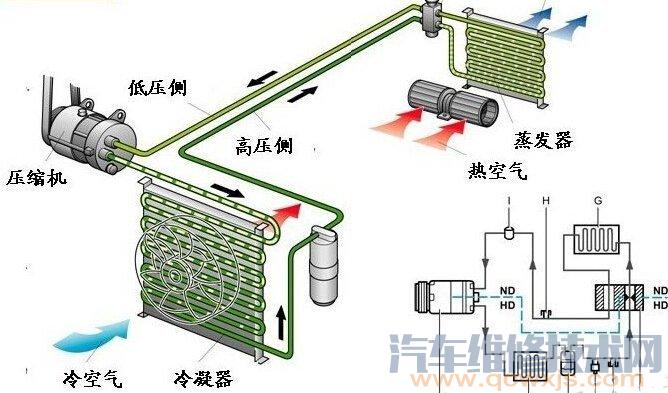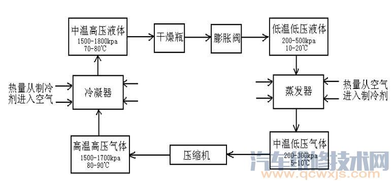 鼓風(fēng)機(jī)吹入車廂。氣態(tài)的制冷劑又被壓縮機(jī)抽走,泵入冷凝器,如此使制冷劑進(jìn)行封閉的循環(huán)流動,不斷地將車廂內(nèi)的熱量排到車外,使車廂內(nèi)的氣溫降至適宜的溫度。