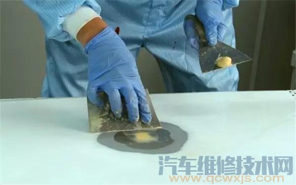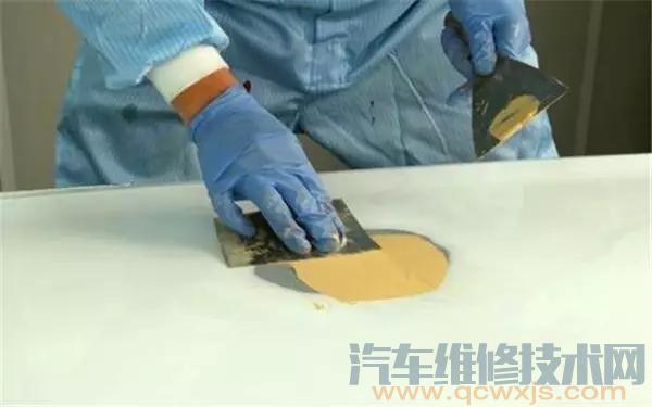 1、在刮刀上取少量膩?zhàn)?,刮刀幾乎直立,在打磨件上用力刮上薄薄的一層,在于填補(bǔ)