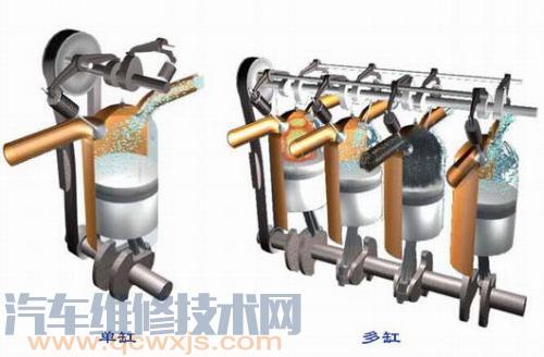 可以分為單缸發動機和多缸發動機。僅有一個汽缸的發動機稱為單缸發動機;有兩個以上汽缸的發動機稱為多缸發動機,如雙缸、3缸、4缸、5缸、6缸、8缸、12缸等都是多缸發動機。現代車用發動機多采用4缸、6缸、8缸發動機。