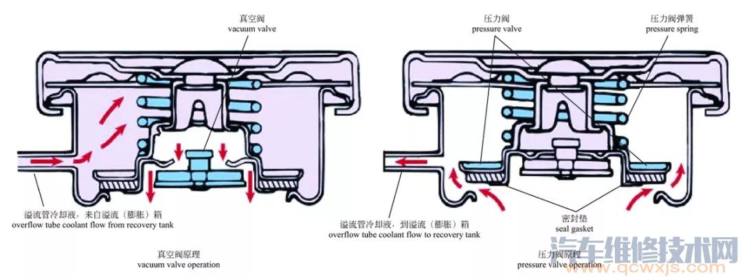 散熱器蓋的作用是密封水冷系統并調節系統的工作壓力。當發動機工作時,冷卻液的溫度逐漸升高。由于冷卻液容積膨脹使冷卻系統內的壓力增高,當壓力超過預定值時,壓力閥開啟,一部分冷卻液經溢流管流入補償水桶,以防止冷卻液脹裂散熱器。當發動機停機后,冷卻液的溫度下降,冷卻系統內的壓力也隨之降低。當壓力降到大氣壓力以下出現真空時,真空閥開啟,補償水桶內的冷卻液部分地流回散熱器,可以避免散熱器被大氣壓力壓壞。