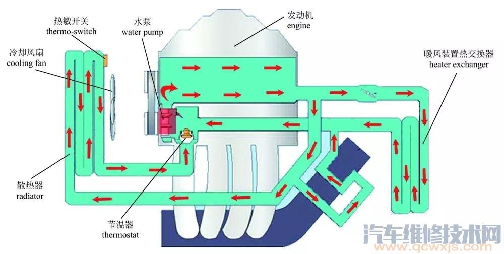 汽車發動機冷卻系統是以水作為冷卻介質,把發動機受熱零件吸收的熱量散發到大氣中去。目前汽車發動機上采用的水冷系大都是強制循環式水冷系,利用水泵強制水在冷卻系中進行循環流動。