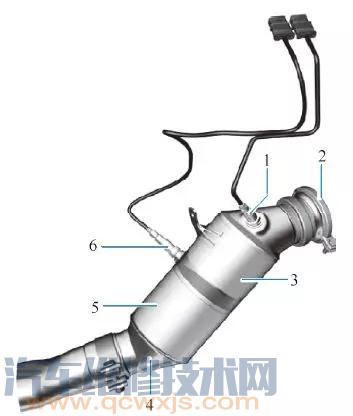 1—催化轉(zhuǎn)換器前氧傳感器;2—廢氣渦輪增壓器上的接口;3—陶瓷載體Ⅰ;4—催化轉(zhuǎn)換器;5—陶瓷載體Ⅱ;6—催化轉(zhuǎn)換器后氧傳感器