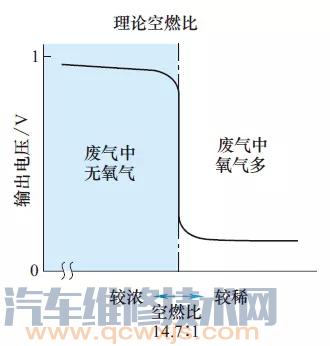 在高溫及鉑的催化下,帶負電的氧離子吸附在氧化鋯套管的內(nèi)外表面上。由于大氣中的氧氣比廢氣中的氧氣多,套管上與大氣相通一側(cè)比廢氣一側(cè)吸附更多的負離子,兩側(cè)離子的濃度差產(chǎn)生電動勢。當套管廢氣一側(cè)的氧濃度低時,在電極之間產(chǎn)生一個高電壓(0.6~1V),這個電壓信號被送到ECU放大處理,ECU 把高電壓信號看作濃混合氣,而把低電壓信號看作稀混合氣。根據(jù)氧傳感器的電壓信號,發(fā)動機ECU 按照盡可能接近14.7∶1的理論最佳空燃比來稀釋或加濃混合氣。因此氧傳感器是電子控制燃油計量的關(guān)鍵傳感器。