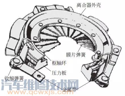 從上面的介紹中可以看出,膜片彈簧既是壓緊彈簧,又是分離杠桿,使結(jié)構(gòu)簡化。另外膜片彈簧的彈簧特性優(yōu)于圓柱螺旋彈簧,所以膜片彈簧離合器的應(yīng)用越來越廣泛,在各種車型上都有應(yīng)用。