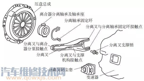如圖6所示,膜片彈簧式離合器的分離機(jī)構(gòu)主要由分離叉、分離軸承和分離軸承座組成。踏下離合器踏板時(shí),離合器操縱機(jī)構(gòu)將力傳遞到分離叉,分離叉起杠桿作用,這個(gè)“杠桿”的支點(diǎn)即分離叉支撐點(diǎn),分離叉推動(dòng)分離軸承座使分離軸承壓向膜片彈簧,使離合器分離。分離軸承固定環(huán)起連接分離軸承座和分離叉的作用。