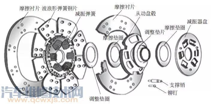 一般離合器由摩擦片、彈簧片、壓盤以及動(dòng)力輸出軸組成