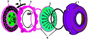 1-離合器蓋2-膜片彈簧3-壓盤(pán)4-傳動(dòng)片5-從動(dòng)盤(pán)6-支承環(huán)