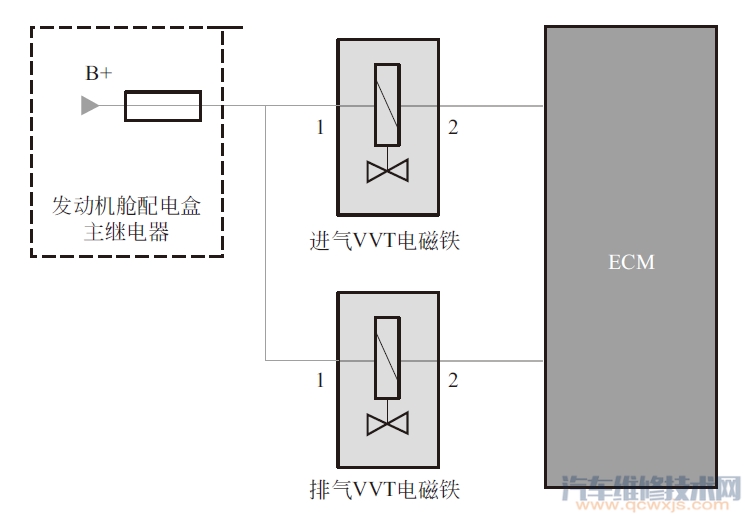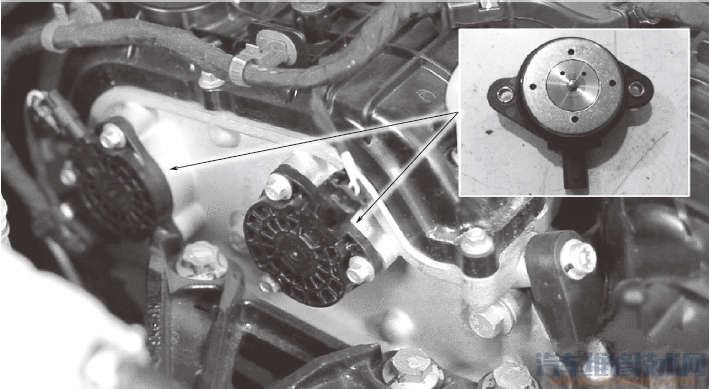 VVT電磁鐵安裝在進(jìn)、排氣凸輪軸鏈輪側(cè)鏈輪室罩蓋上,它們接收發(fā)動(dòng)機(jī)控制模塊的指令信號(hào),對(duì)VVT電磁閥進(jìn)行控制,從而實(shí)現(xiàn)氣門正時(shí)調(diào)控功能。VVT電磁鐵如下圖所示。