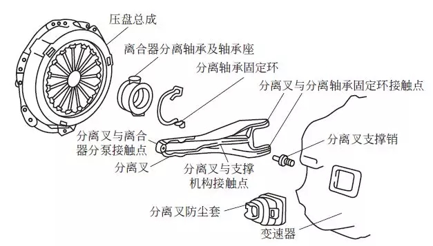如下圖所示,膜片彈簧式離合器的分離機(jī)構(gòu)主要由分離叉、分離軸承和分離軸承座組成。踏下離合器踏板時(shí),離合器操縱機(jī)構(gòu)將力傳遞到分離叉,分離叉起杠桿作用,這個(gè)“杠桿”的支點(diǎn)即分離叉支撐點(diǎn),分離叉推動(dòng)分離軸承座使分離軸承壓向膜片彈簧,使離合器分離。分離軸承固定環(huán)起連接分離軸承座和分離叉的作用。