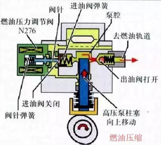 泵活塞上行在泵腔內(nèi)產(chǎn)生壓力,當(dāng)壓力超過油軌內(nèi)壓力時,出油閥就被打開,燃油被泵入油軌。
