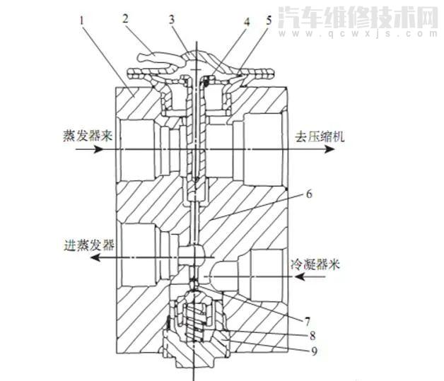 (1)節流作用。高溫高壓的液態制冷劑經過膨脹閥的節流孔節流后,成為低溫低壓的霧狀制冷劑,為制冷劑的蒸發創造條件。