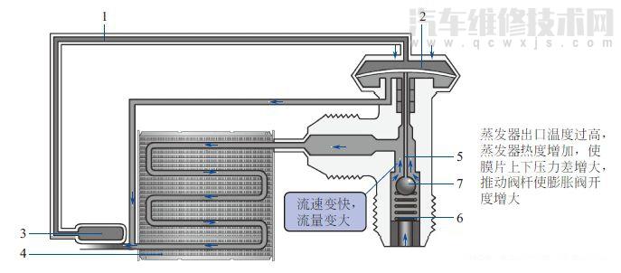 進入蒸發器的液態制冷劑,經過蒸發器后,制冷劑由液態蒸發為氣態,吸收熱量,降低車內的溫度。膨脹閥控制制冷劑的流量,保證蒸發器的出口完全為氣態制冷劑,若流量過大,出口含有液態制冷劑,可能進入壓縮機產生液擊;若制冷劑流量過小,提前蒸發完畢,造成制冷不足;