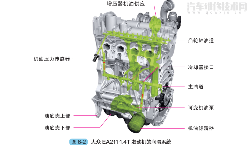 大眾 EA211 1.4T 發動機潤滑系統的結構如圖 6-2 所示。
