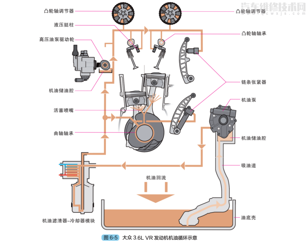 大眾 3.6L VR 發動機的機油循環回路如圖 6-5 所示。