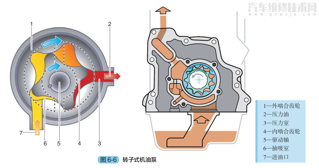 轉子式機油泵(圖 6-6) 由一個內轉子和一個外轉子組成。內轉子為被驅動部件,外轉子在內轉子的齒上滾動,并以這種方式在機油泵殼體內旋轉。內轉子比外轉子少一個齒,因此每轉動一圈就可將機油從一個外轉子齒隙壓送到下一個齒隙。轉動時吸油側空間增大,而壓力側空間相應減小。這種結構可在流量較大的情況下產生較高壓力。
