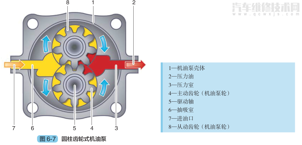 圓柱齒輪式機油泵(圖 6-7)為外嚙合齒輪泵,通常設計為油底殼泵(布置在油底殼上)。這種機油泵的兩個外嚙合齒輪相互嚙合在一起,其中一個是驅動齒輪。未嚙合齒輪的齒頂沿機油泵殼體滑動,將機油從抽吸室輸送至壓力室。