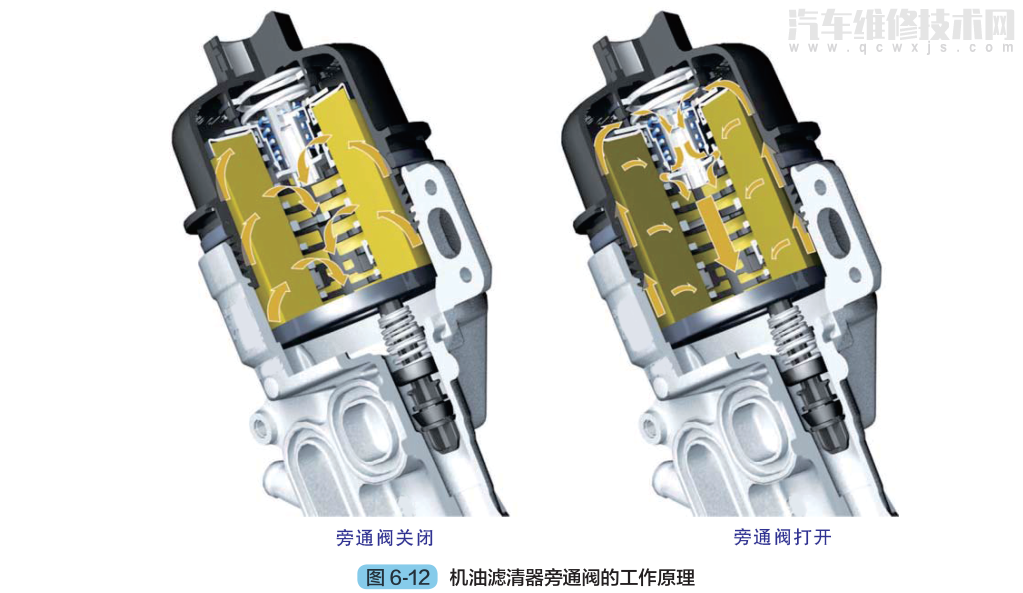為在機油濾清器堵塞時為潤滑部位供油,在與濾清器平行的位置裝有濾清器旁通閥。濾清器堵塞時,其前后的機油壓力差增大,旁通閥就會打開,從而確保機油(雖未經過濾) 仍可到達潤滑部位。機油濾清器旁通閥的工作原理如圖 6-12 所示。