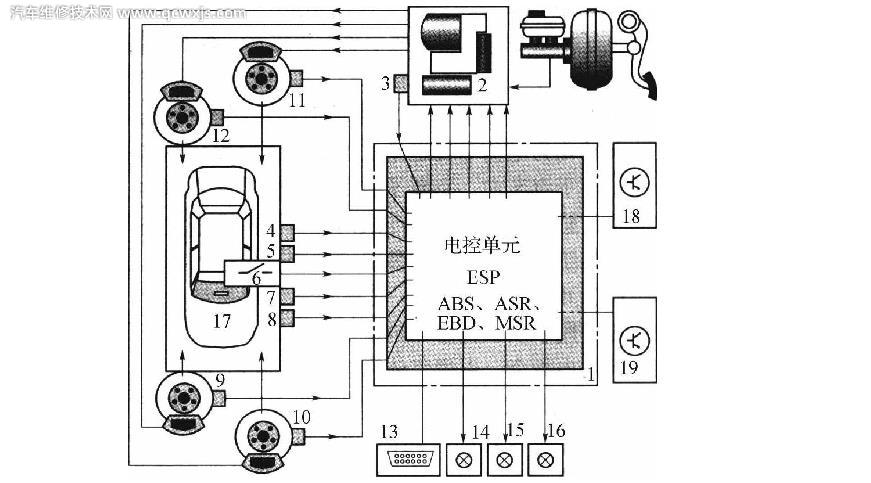 1—ESP電控單元 2—液壓控制單元 3—制動壓力傳感器 4—側向加速度傳感器 5—橫向偏擺率傳感器 6—ASR/ESP按鈕 7—轉向盤轉角傳感器 8—制動燈開關 9~12—輪速傳感器 13—自診斷接口 14—制動系統警告燈 15—ABS警告燈 16—ABS/ESP警告燈 17—車輛駕駛狀態 18—發動機控制調整 19—變速器控制調整