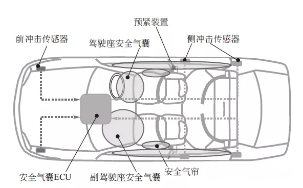 為了在碰撞時能夠提前響應,沖擊傳感器布置于緩沖區,將碰撞時的加速度發送至ECU。ECU布置于中央扶手下的地板面,內部裝有2個加速度傳感器(檢測軸不同,分別用于前碰撞和側碰撞),結合沖擊傳感器檢測的加速度,ECU進行碰撞判斷。判斷需要打開安全氣囊時,系統具有以下功能:向安全氣囊模塊、預緊裝置提供點火電流的點火功能;進行系統故障診斷的功能;碰撞時,即使蓄電池脫落也能確保點火電流的電容器繼續供電的功能。