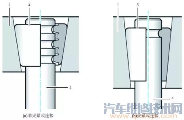 1—氣門彈簧座;2—非夾緊式氣門鎖夾;3—夾緊式氣門鎖夾;4—氣門桿