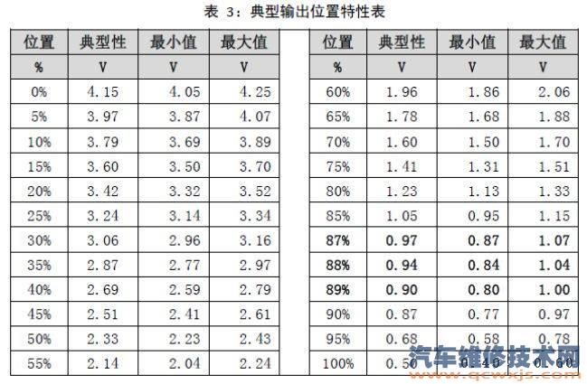 通過診斷儀輸出控制設定0%及100%目標開度如果傳感器輸出電壓滿足表3 特性值表示節氣門自學習成功 。