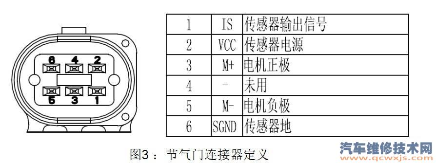 節氣門連接器管腳定義,如圖3 所示。Pin2 傳感器供電電壓 5V±0.1V, Pin3/5 腳 電機兩極電阻小于50 Ω 。