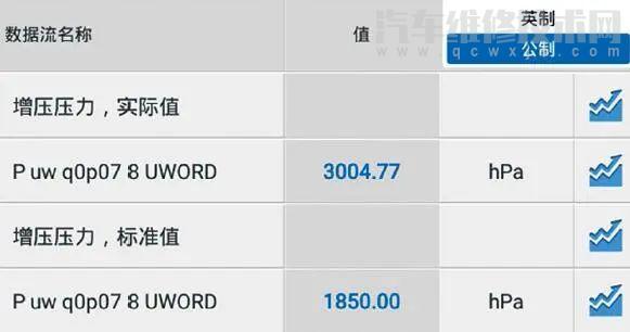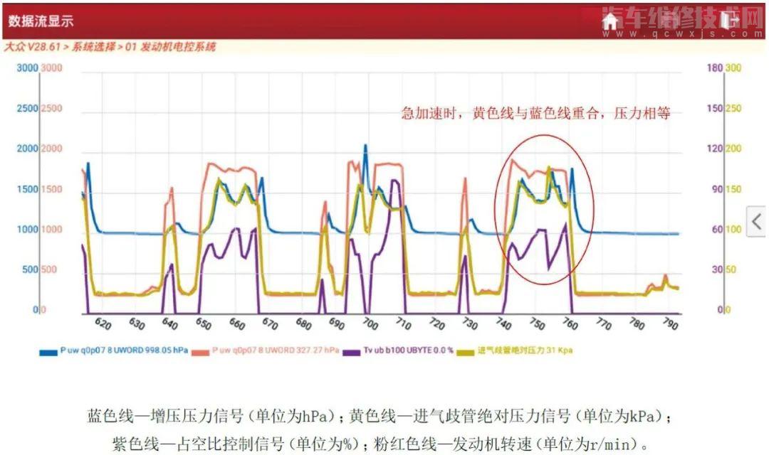 分析認為,2個傳感器同時發(fā)生信號失真的可能性極小,J623故障可能性也較低,暫時排除上述第1種可能,由此推測進氣增壓壓力確實不足。