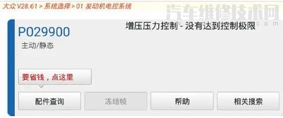 接車后試車,車主反映的故障現(xiàn)象屬實。使用故障檢測儀檢測,發(fā)動機控制單元(J623)存儲有故障代碼“P029900 增壓壓力控制-沒有達到控制極限 主動/靜態(tài)”(圖1),根據(jù)故障代碼提示,懷疑進氣增壓壓力低。