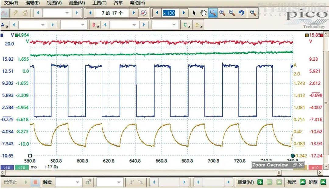 根據(jù)圖4,用pico示波器測量N75的供電波形(紅色)、控制信號波形(藍色)及其工作電流波形(黃色),同時測量G31的信號電壓波形(綠色)。