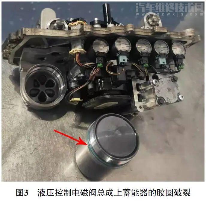 根據上述擋位換擋撥叉阻滯類故障代碼的維修建議,維修人員首先檢查TCM的供電和搭鐵。經過檢查,TCM的供電和搭鐵均正常。由于該車的故障不屬于單一換擋撥叉阻滯故障,而多個換擋撥叉同時存在故障的可能性比較小,根據廠家給出的修理指導意見,接下來準備更換液壓控制電磁閥總成。更換液壓控制電磁閥總成在車上即可進行,考慮到該車行駛里程數較多,在征得客戶同意后,將變速器從車上拆下,決定對變速器做一個全面的檢查。拆檢變速器,發現液壓控制電磁閥總成上蓄能器的密封圈已破裂(圖3)。對雙離合器進行檢查,發現雙離合器磨損較大。根據上述檢查,維修人員決定更換蓄能器的密封圈和雙離合器。