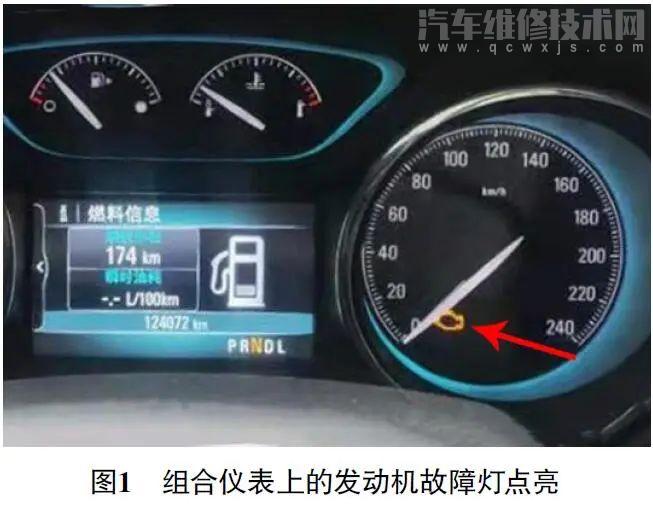 接車后首先試車,起動發動機,將換擋桿換入前進擋或倒擋,車輛均不能行駛,同時組合儀表上的發動機故障燈點亮(圖1)。