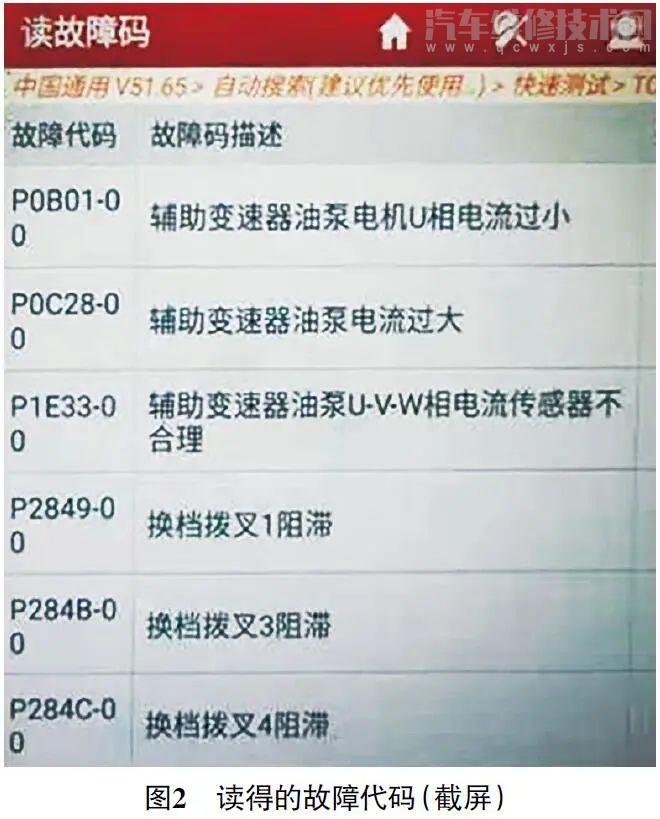 用故障檢測儀檢測,讀得的故障代碼為“P0B01 輔助變速器油泵電機U相電流過小”“P0C28 輔助變速器油泵電流過大”“P1E33 輔助變速器油泵U-V-W相電流傳感器不合理”“P2849 換擋撥叉1阻滯”“P284B 換擋撥叉3阻滯”“P284C 換擋撥叉4阻滯”(圖2)。