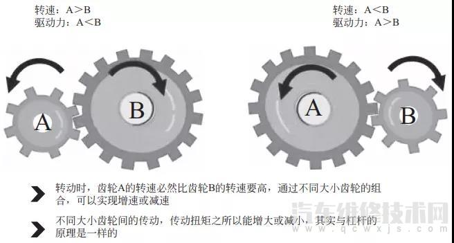 變速器為什么可以調(diào)整發(fā)動機輸出的轉(zhuǎn)矩和轉(zhuǎn)速呢?其實這里蘊含了齒輪和杠桿的原理。變速器內(nèi)有多個不同的齒輪,通過不同大小的齒輪組合一起,就能實現(xiàn)對發(fā)動機轉(zhuǎn)矩和轉(zhuǎn)速的調(diào)整。用低轉(zhuǎn)矩可以換來高轉(zhuǎn)速,用低轉(zhuǎn)速則可以換來高轉(zhuǎn)矩。