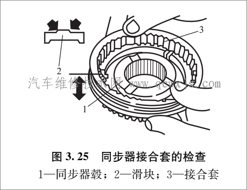 同步器接合套需檢查同步器接合套的內齒部 分的磨損,檢查方法如圖3 .25所示。將接合套3 放在有滑塊2的同步器轂1上,應能帶動滑塊2 沿同步器轂1的軸向順利移動,否則應更換同步 器接 。