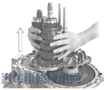 ③ 向上取出5 擋變速叉及同步器,再取下五擋被動齒輪。