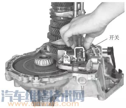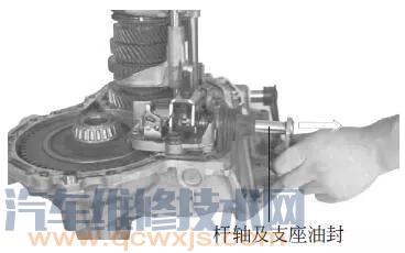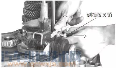 先向下按住倒擋撥叉再向外取下倒擋撥叉銷,并取下倒擋撥叉。