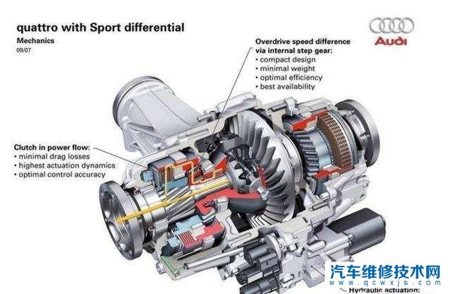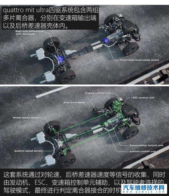 現款奧迪車型匹配的是最新研發的quattro ultra 四驅系統,這套四驅系統雖然從原來的全時四驅變成了所謂的“四驅可用”,但是在汽車高速行駛過程中,或者在濕滑路面環境下,這套四驅系統可以在0.5秒內迅速結合結合,在0.2秒內進行前后軸動力分配,特別是在高速過彎時,可以通過車身的各種傳感器檢測奧迪車身的各個參數,從而主動地控制四驅系統的結合進行動力分配,從而增加了汽車高速行駛的安全性。