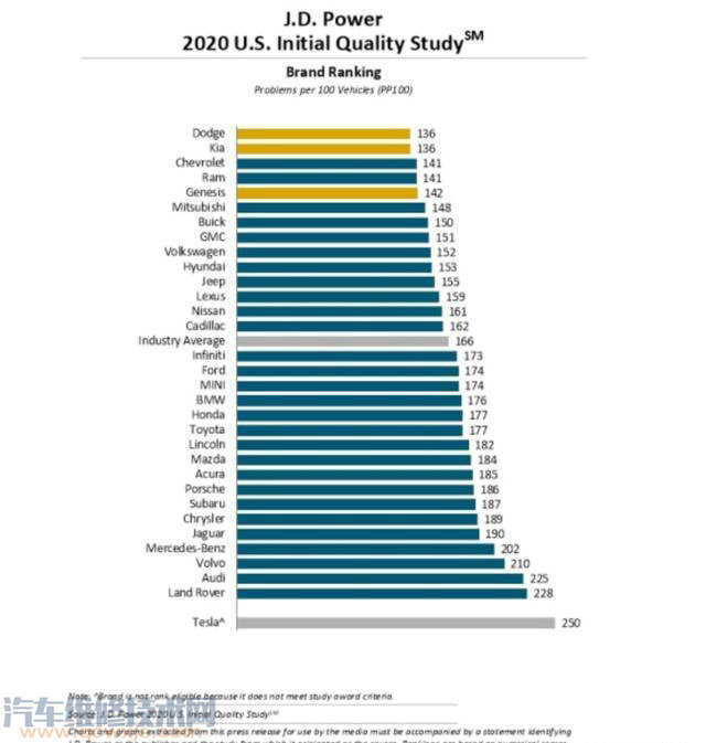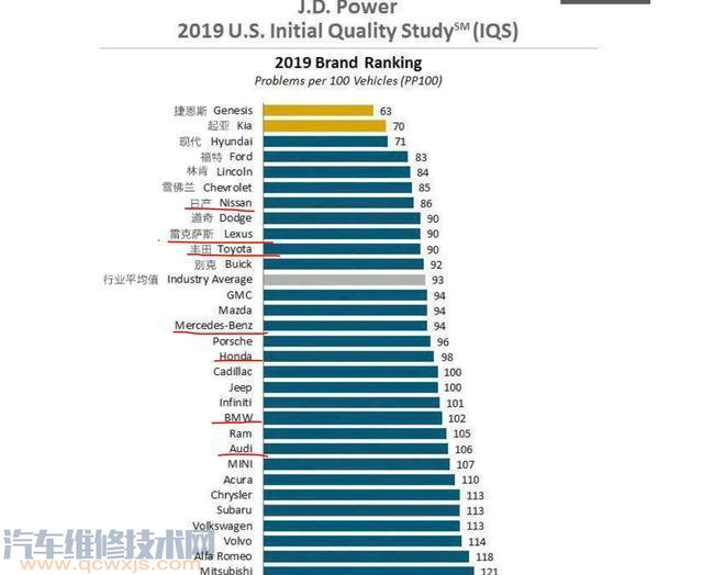實際上從可靠性來說,BBA的確不怎么樣,在行業內部,往往通過第三方的調查機構來衡量新車的故障率,而J.D. Power就是這樣的一家機構,通過對消費者調查以及市場研究和咨詢、匯總數據分析、對比來評測新車的故障率,下圖是美國市場在2019年的新車故障率排行,我們可以看到,奔馳、寶馬、奧迪的故障率均高于行業平均水平,倒是本田的成績有些意外。