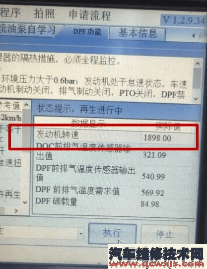 如果發動機轉速不正常,請檢查進氣系統及影響進氣的相關部件;如果再生過程中發動機轉速在上下波動,則查看是否為排