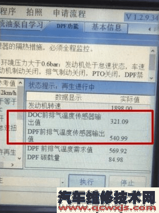 如果再生時發動機轉速正常,則持續關注T4溫度(DOC前排氣溫度傳感器輸出值)及T5溫度( DPF前排氣溫度傳感器輸出值)。
