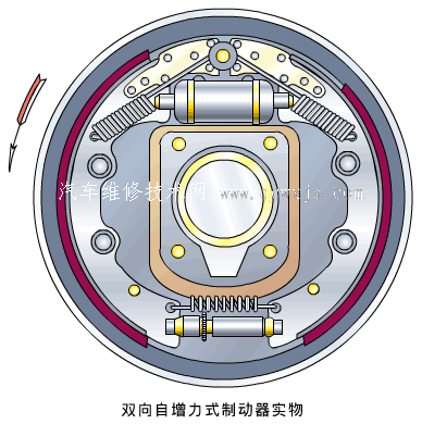 是兩個制動蹄的上方有一個雙活塞制動輪缸,輪缸的上方還有一個制動蹄支承銷,兩制動蹄的下方用頂桿相連。無論汽車前進還是倒車,都與自增力式制動器相當,故稱雙向自增力式制動器。