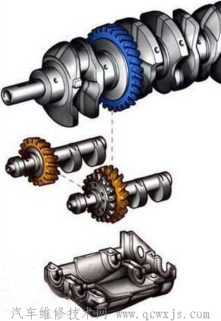 為了消除這種振動,設計者采用了很多方法,例如采用輕質的活塞減少運動件的質量、提高曲軸的剛度、采用60度夾角的“V”型布置發動機等等。增加平衡軸(如上圖中間位置所示部件)也是這些辦法其中之一,簡單說平衡軸其實就是一個裝有偏心重塊并隨曲軸同步旋轉的軸,利用偏心重塊所產生的反向振動力,使發動機獲得良好的平衡效果,降低發動機振動。