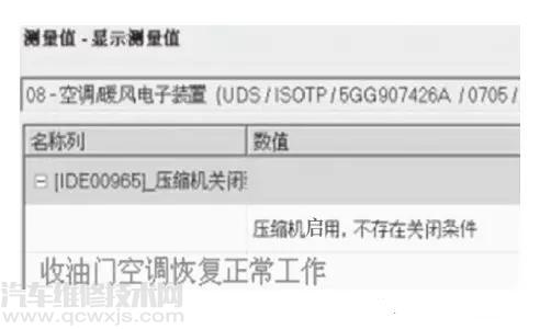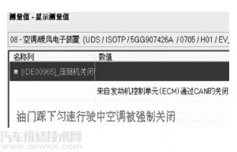 通過觀察真空壓力數(shù)據(jù)流發(fā)現(xiàn),在行駛過程中,故障車制動(dòng)助力器單元中的壓力偏高,讀取空調(diào)控制單元內(nèi)壓縮機(jī)關(guān)閉條件的數(shù)據(jù)流(下圖),顯示“來自發(fā)動(dòng)機(jī)控制單元(ECM)通過CAN的關(guān)閉”;