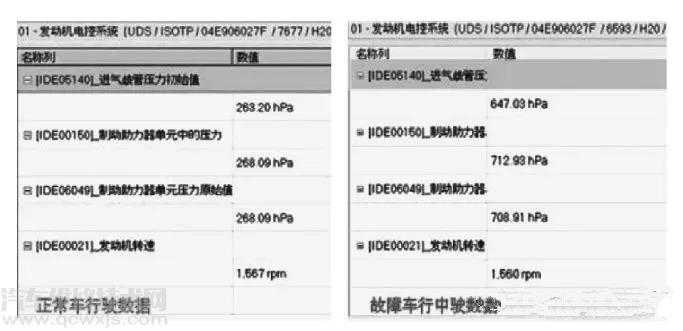 由于故障現(xiàn)象只出現(xiàn)在車輛行駛中,也就是加速踏板處于踩下的狀態(tài),而且儀表臺(tái)上曾出現(xiàn)過“制動(dòng)助力失效”的提示,因此,在試車過程中,對(duì)發(fā)動(dòng)機(jī)數(shù)據(jù)組中真空助力器的真空壓力進(jìn)行重點(diǎn)監(jiān)測,并將相關(guān)數(shù)據(jù)與正常車輛進(jìn)行對(duì)比,如下圖所示。